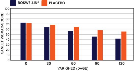 Ved brug af udtræk af harpiks fra indisk røgelsestræ blev der påvist et betydeligt fald i WOMAC-indikatoren, hvilket peger på smertereduktion, mindre stivhed i leddene samt en forbedring af den fysiske mobilitet. Boswellin® understøtter leddenes korrekte funktion, forbedrer deres elasticitet samt hjælper med at fastholde dem i god stand.